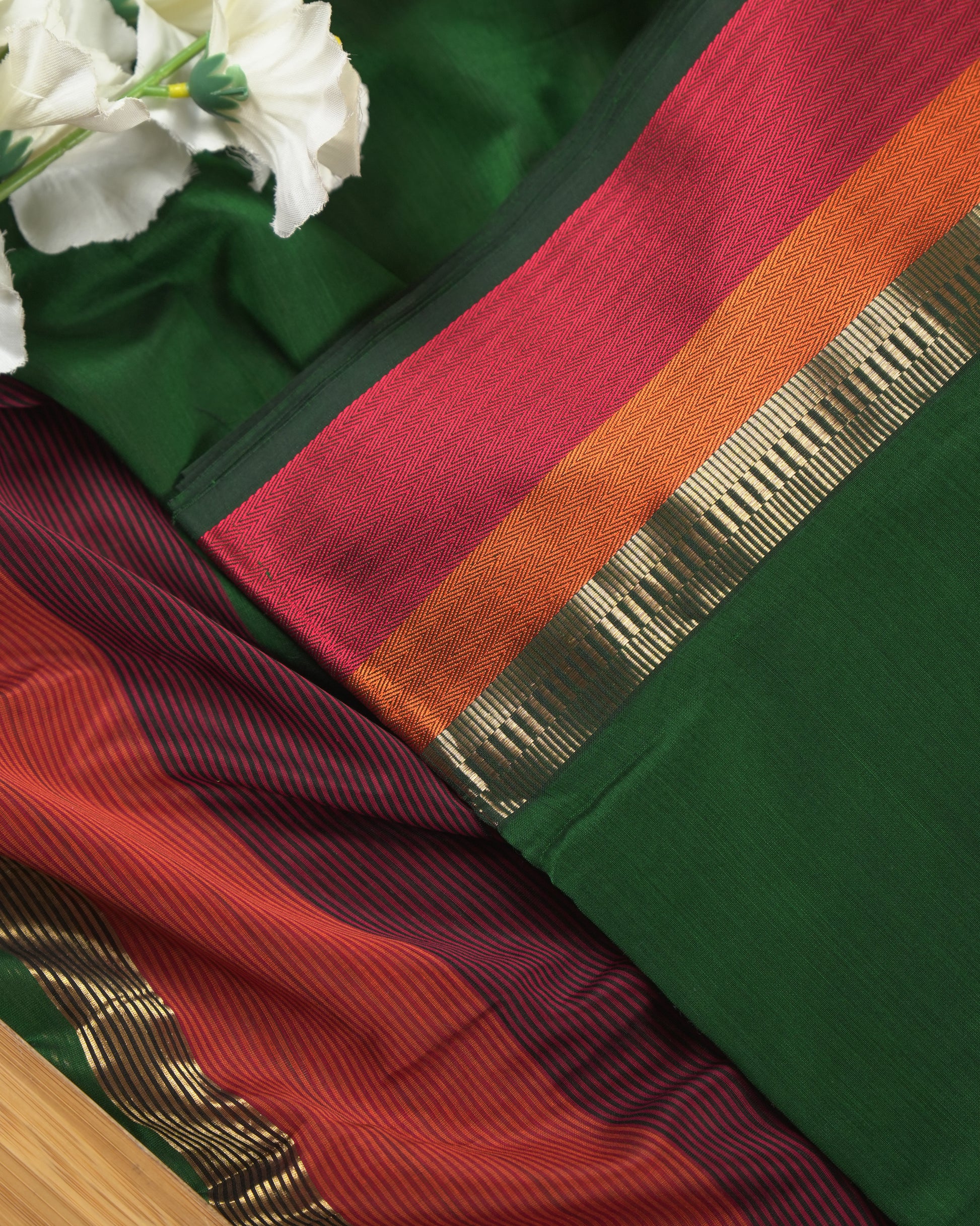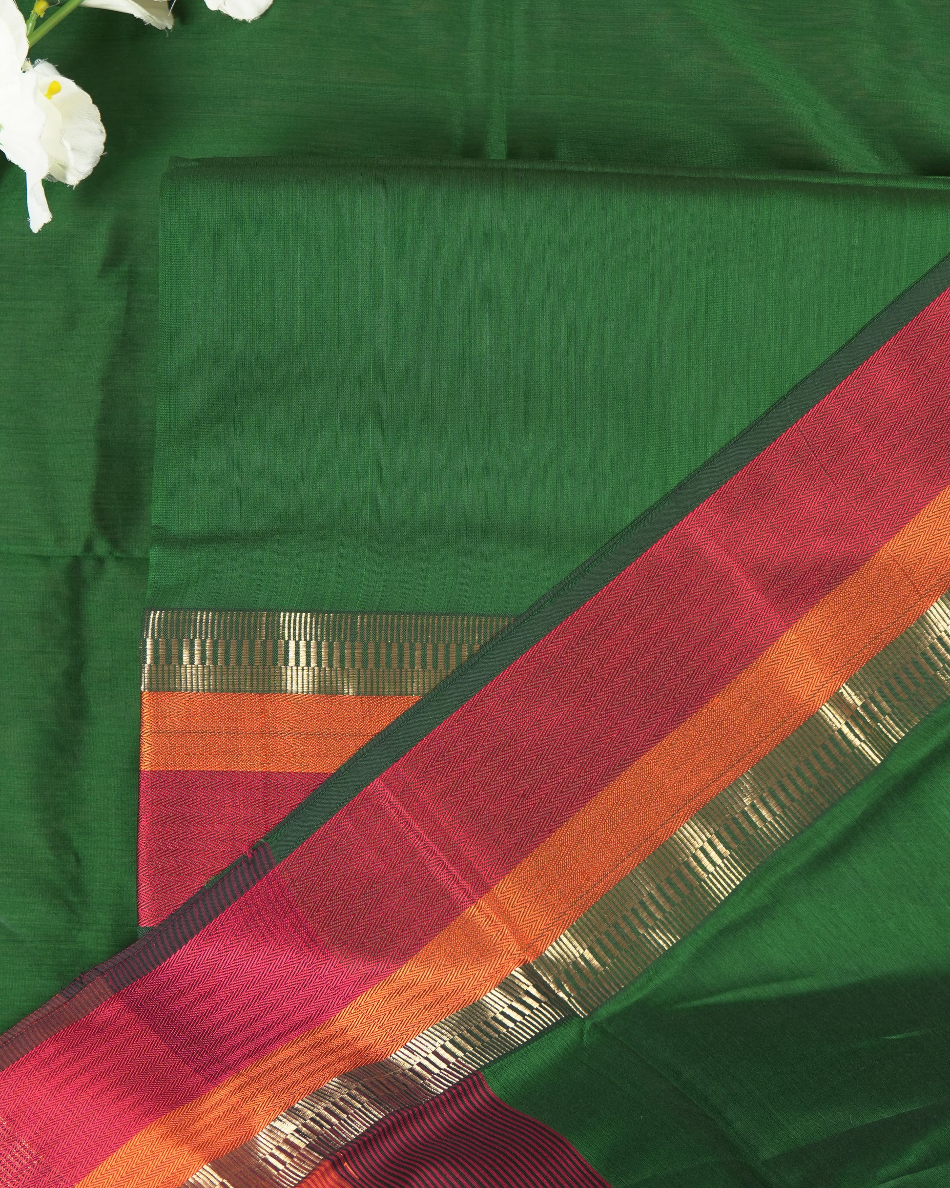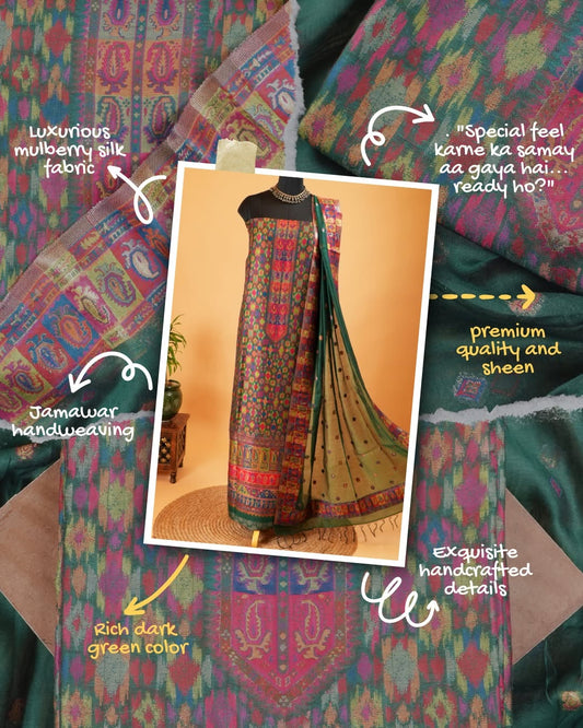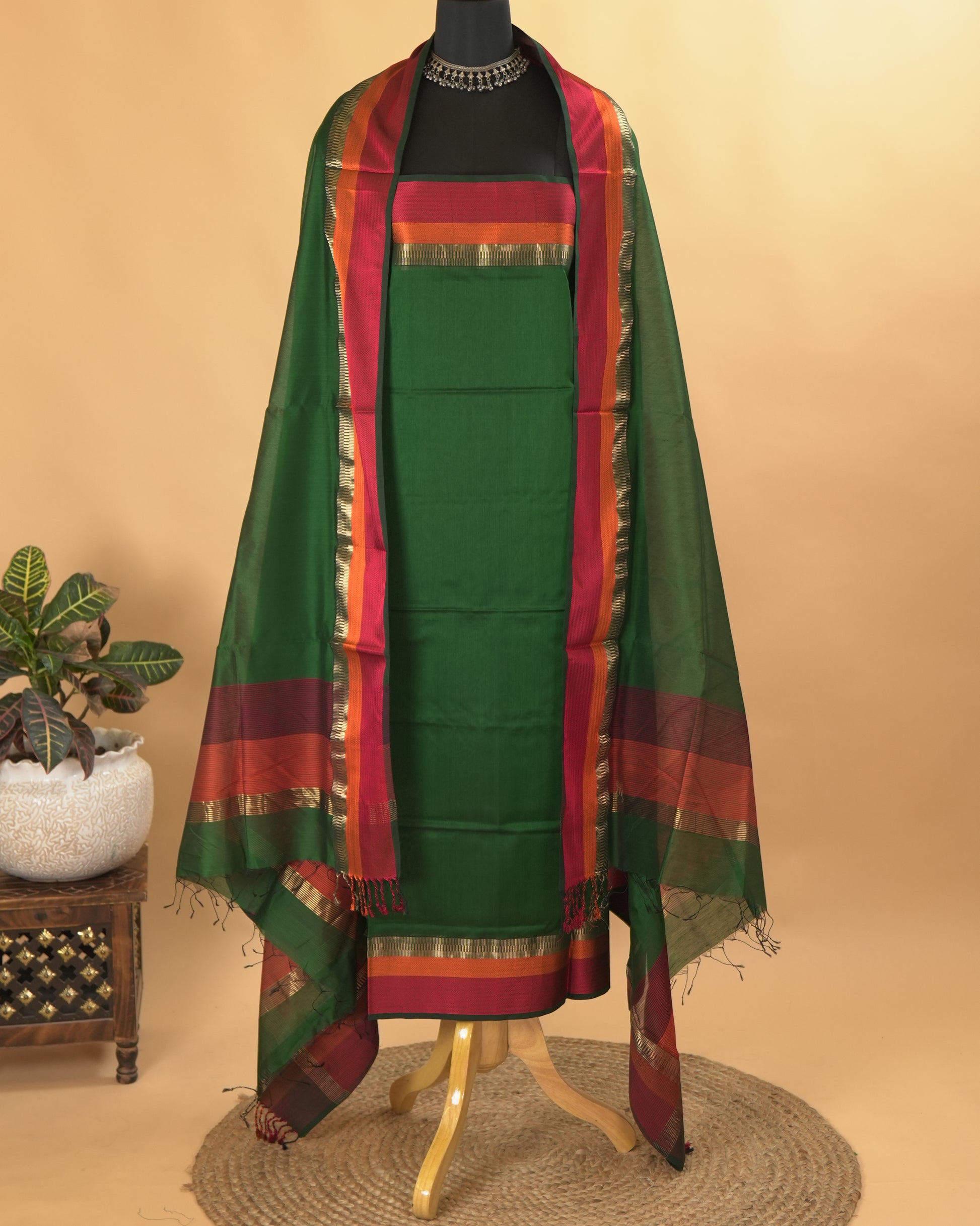 Bottle Green Maheshwari Silk Multi-Coloured Border Suit Set