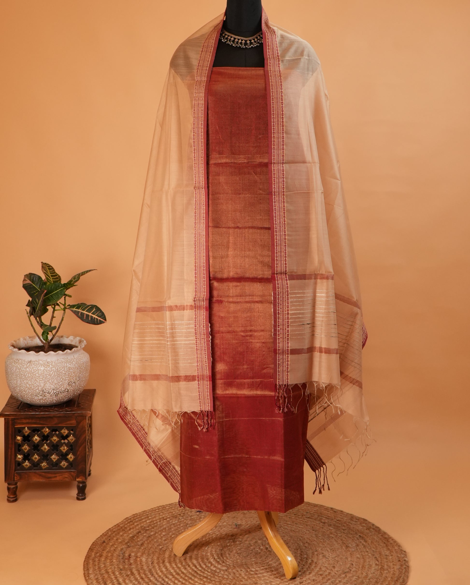 Brown Maheshwari Silk Four Peddle Weave Suit Set