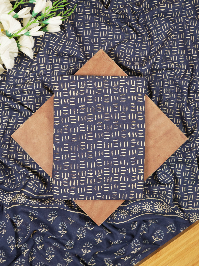 Step into timeless elegance with this indigo blue pure cotton suit set, crafted with delicate hand block prints that echo classic Indian charm. The kurta features intricate floral motifs, beautifully balanced by a geometric printed dupatta with a traditional zari border. The soft cotton fabric ensures breathability and comfort, making it your go-to choice for all-day wear — from festive gatherings to easy everyday chic.