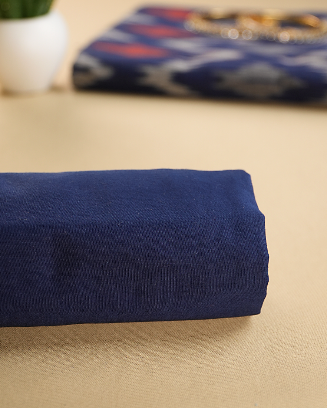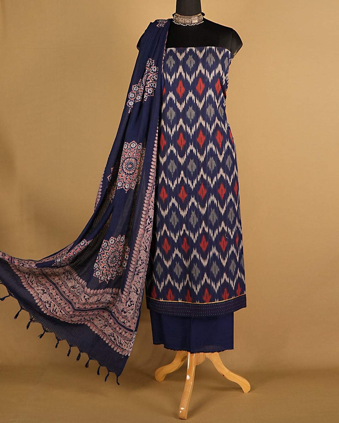 Stunning Navy Blue And Red Ikat Print Handloom Cotton Suit Set