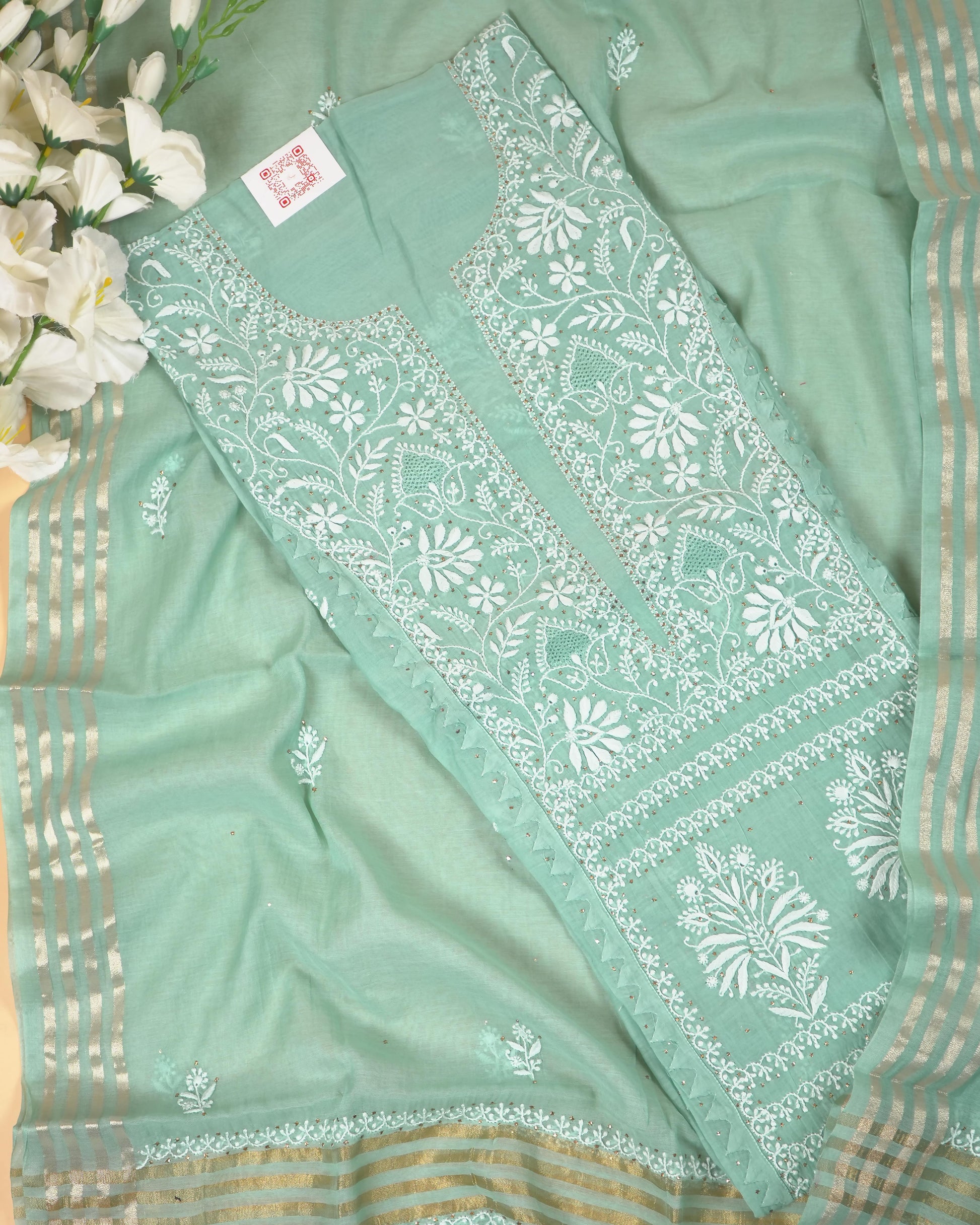 Light Blue Mul Chanderi Lucknowi Handwork Suit Set