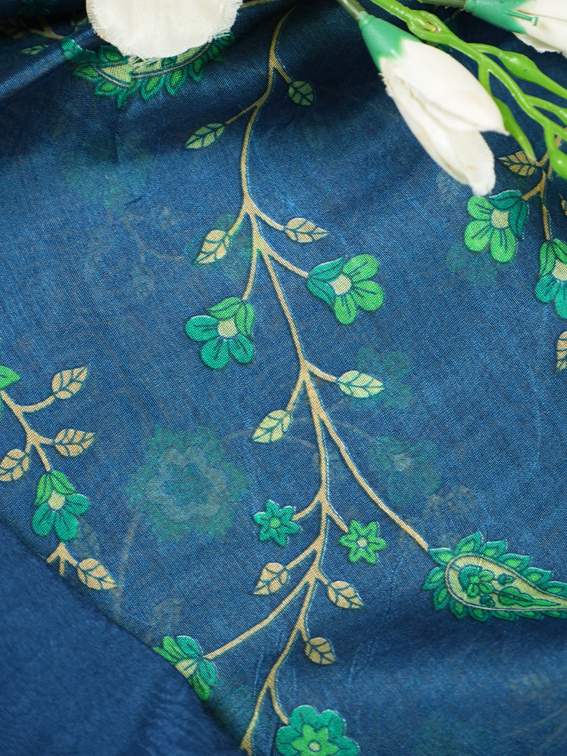 Grace meets tradition in this elegant navy Maheshwari silk suit set, adorned with delicate silver zari bootis on the kurta. The set is paired with a striking dupatta featuring intricate green paisley patterns that add a refreshing pop of color. A matching shantoon bottom completes the look, making it a perfect choice for festive gatherings, cultural occasions, or evening celebrations.