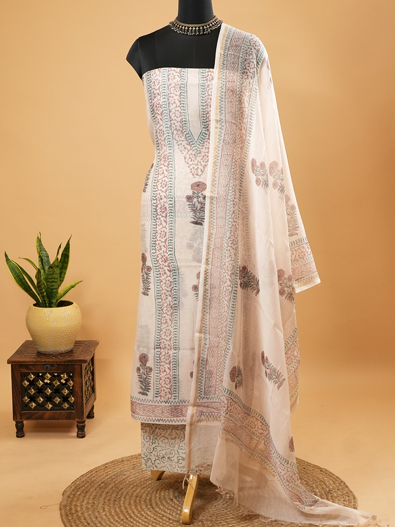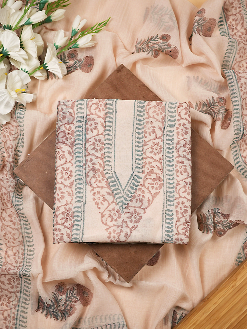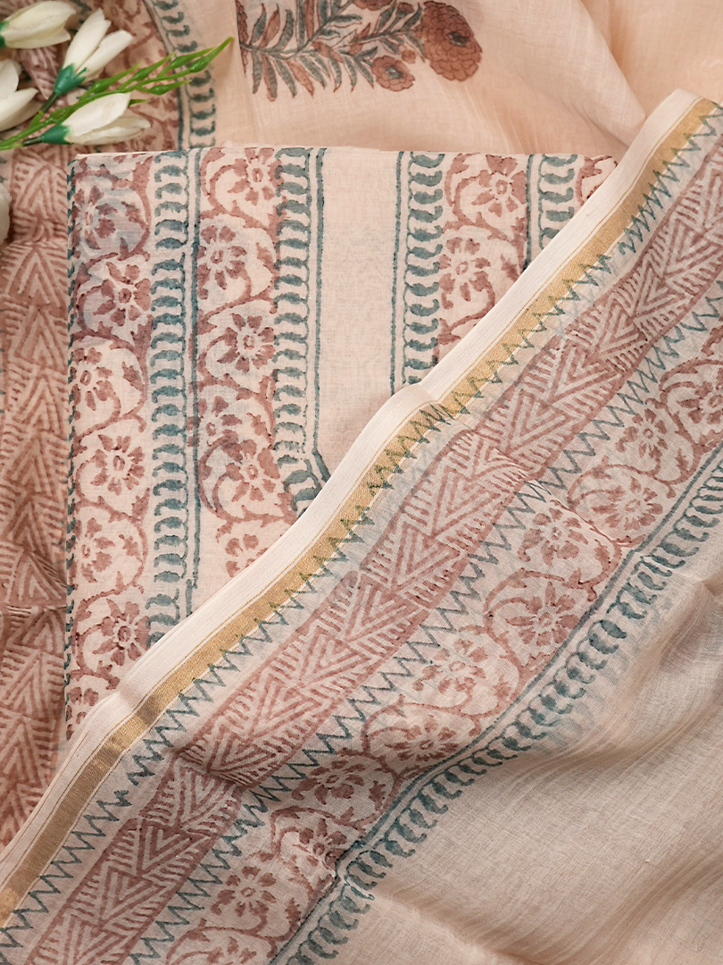 Beige Mul Chanderi Block Print Suit Set