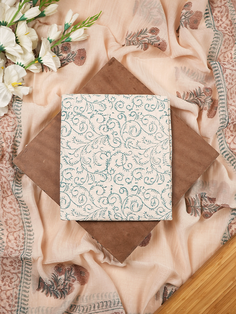 A subtle and elegant suit set in a soft beige tone, featuring delicate hand block floral prints on pure mul chanderi fabric. Paired with a coordinated dupatta and pure cotton bottoms, this set exudes effortless charm and timeless grace.