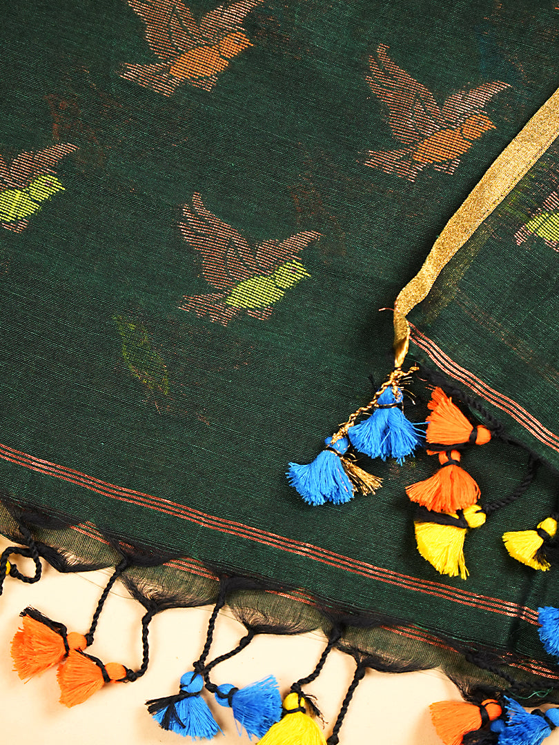 Bottle Green Jayshree Linen Jamdani Suit with Multicolour Bird Motifs