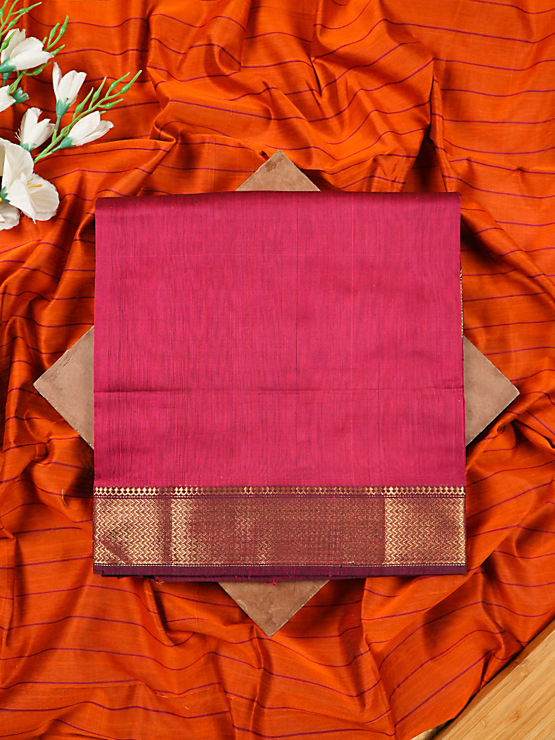 This handloom 2-piece suit set is crafted from Maheshwari silk, offering a refined texture and a subtle natural sheen. The shirt comes in a vibrant solid magenta shade, elegantly detailed with a prominent handwoven golden zari border along the hem. It is paired with a striking, contrasting bright orange Maheshwari silk dupatta. The dupatta is beautifully detailed with a handwoven zari border and features distinct zari stripes along its ends (pallu), finished with traditional black tassels at the corners for a classic, festive look.