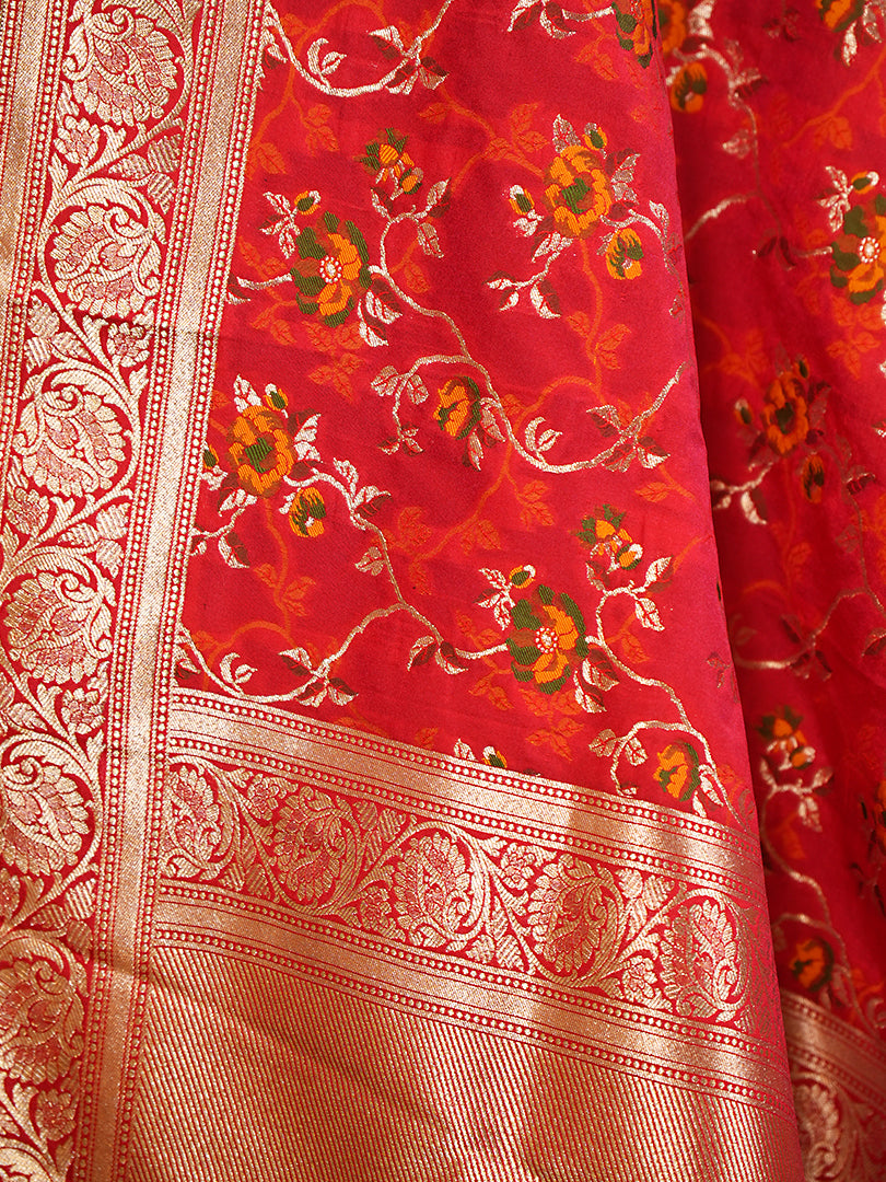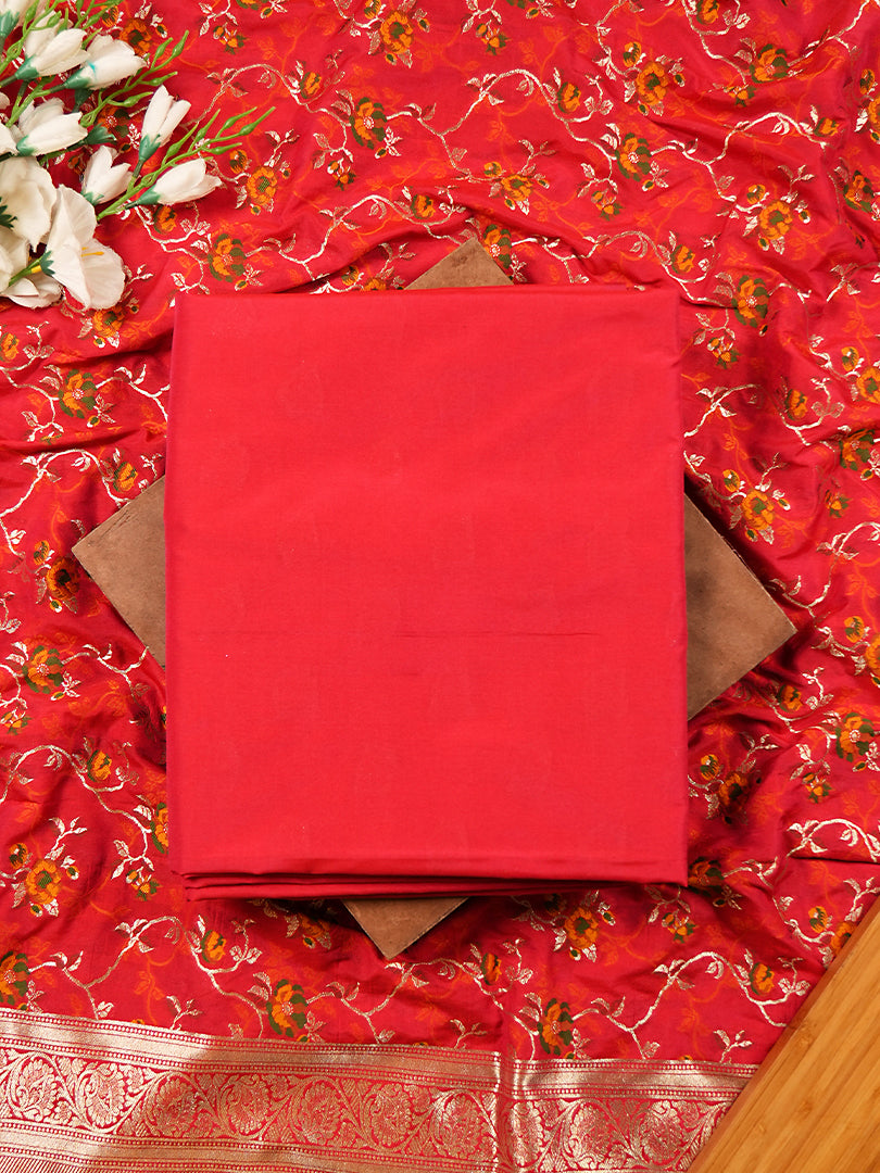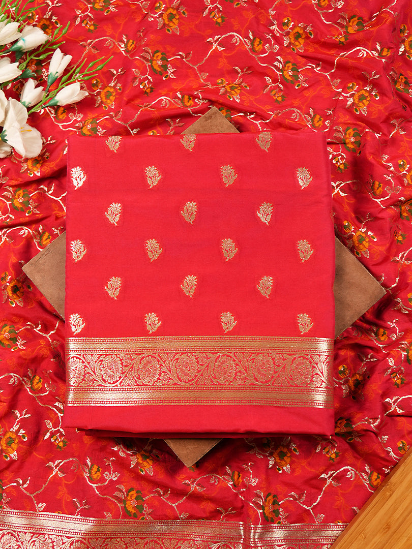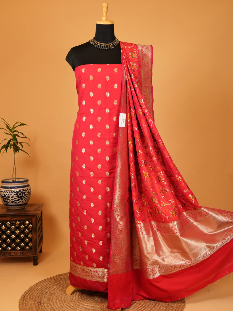 This elegant suit is crafted from pure Katan silk, adorned with intricately woven Banarasi bootis in gold zari. The set includes a luxurious Banarasi silk dupatta featuring delicate floral weaving and a detailed Banarasi border, adding a touch of regal charm. The plain black silk bottom complements the richly textured kurta and dupatta. The fabric showcases a soft sheen, smooth texture, and a graceful fall, making it ideal for festive or formal wear.