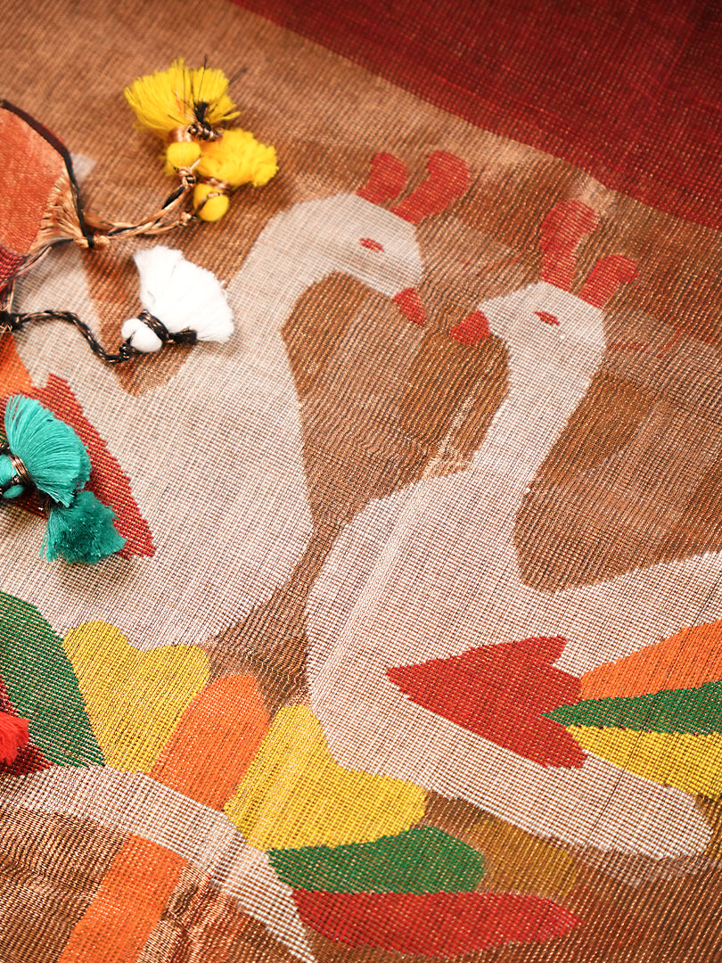 Crafted from luxurious linen tissue blended with mulberry silk, this maroon suit exudes warmth and timeless charm. The kurta features delicate Jamdani weaving with subtle golden and green bootis, creating an elegant contrast against the deep maroon base. Its Paithani-inspired dupatta shines with handwoven motifs and a lustrous silk border, finished with playful handmade tassels. Perfect for festive evenings or intimate celebrations, this piece beautifully blends traditional artistry with understated sophistication.