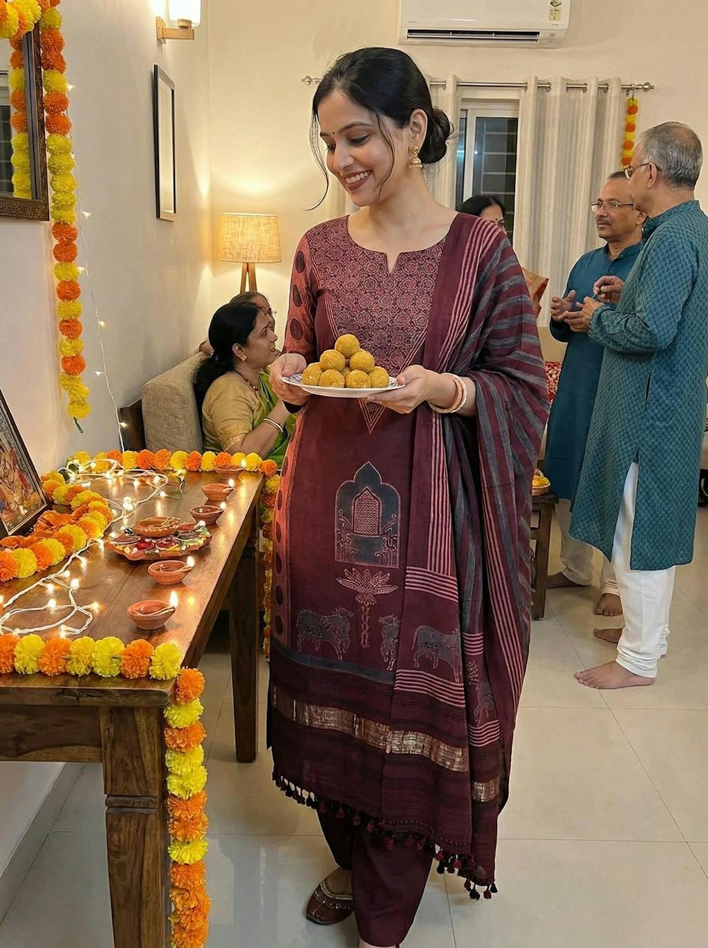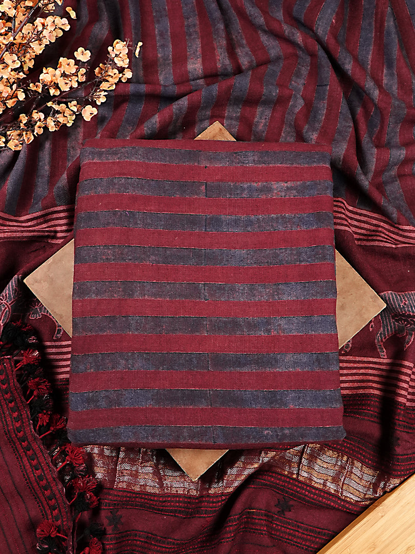 Maroon Pure Merino Wool Ajrakh 3 Piece Suit Set