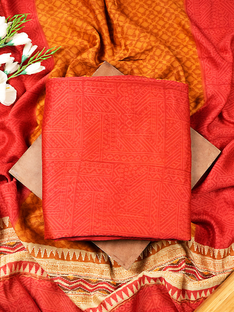 This orange Maheshwari silk suit set features a kurta with subtle woven geometric patterns and a multicolour border highlighted with Kantha stitch. The dupatta comes in a vibrant orange base with a rich red contrast, beautifully detailed with Kantha work that flows across the center and continues seamlessly into the borders, adding character to the design. Finished with multicolour woven edges, the dupatta adds a refined charm to the set. Paired with a premium red shantoon bottom, this outfit makes a timeless choice for festive and special occasions.