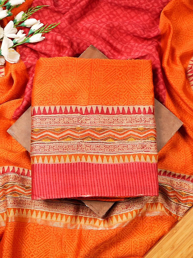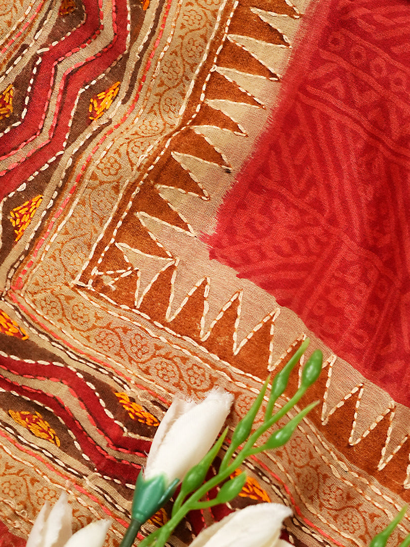 Orange Maheshwari Silk Suit Set With Kantha Detailing