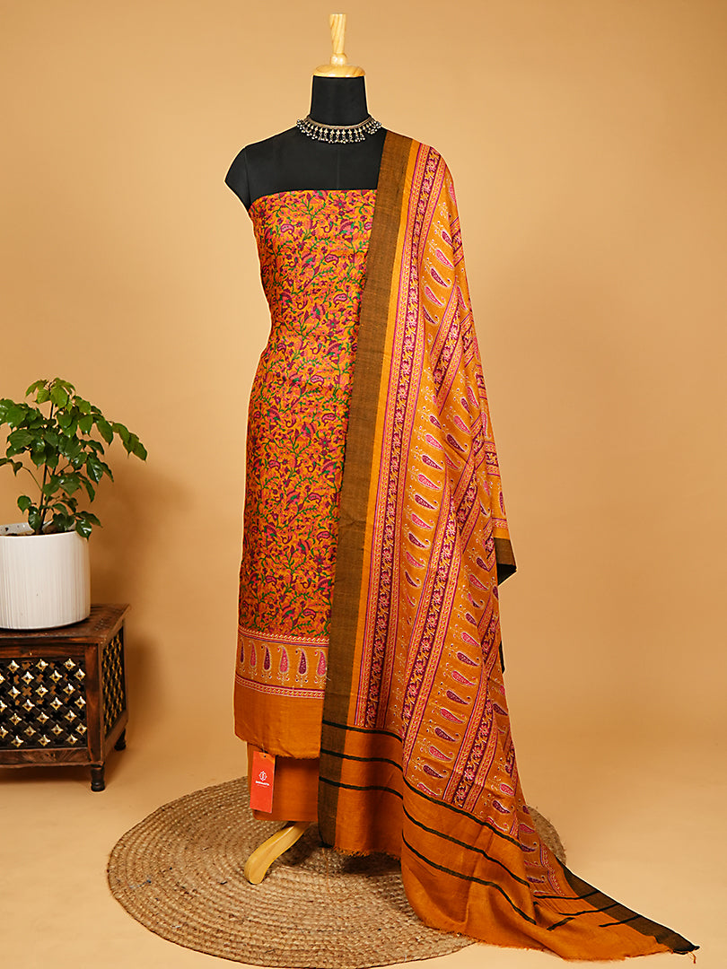 Orange Pure Pashmina Silk Wool Kani Print Suit with Dupatta