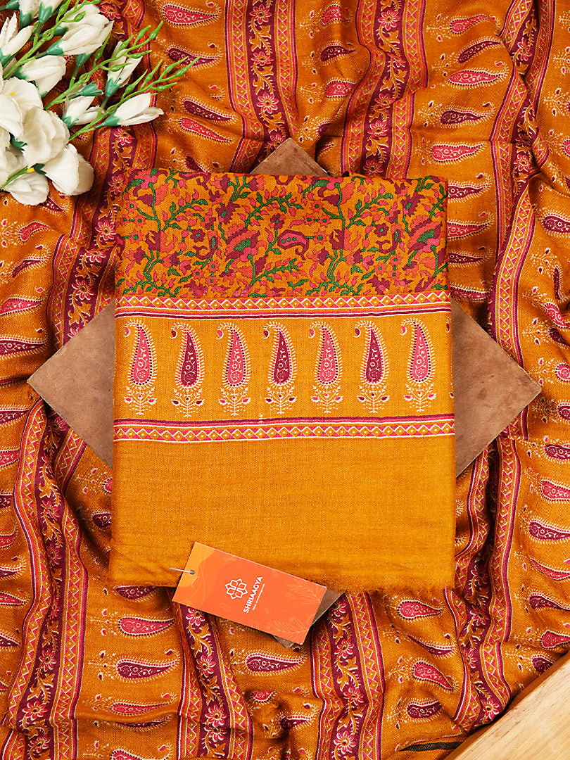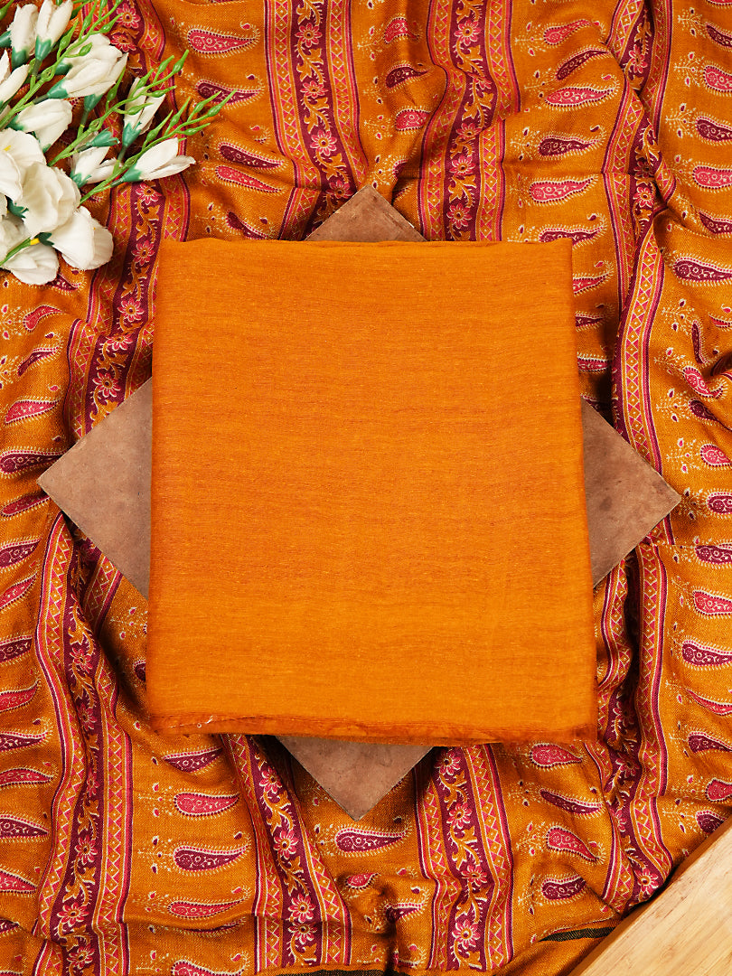 This orange pure pashmina silk wool suit features a detailed Kani-inspired print that gives the fabric a rich, handcrafted look. The pashmina blend feels soft on the skin while providing natural warmth, making it suitable for winter and cooler evenings. The suit is paired with a matching pure pashmina silk wool dupatta, designed with complementing Kani-style borders that add depth and balance to the overall design. Finished with a pashmina silk bottom that ensures comfort and a smooth fall, this suit set is ideal for festive wear, winter functions, and elegant traditional outings.