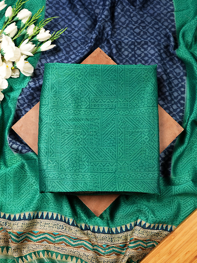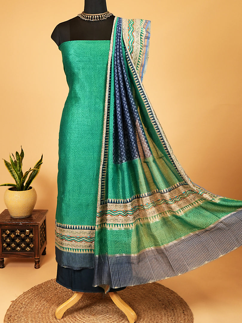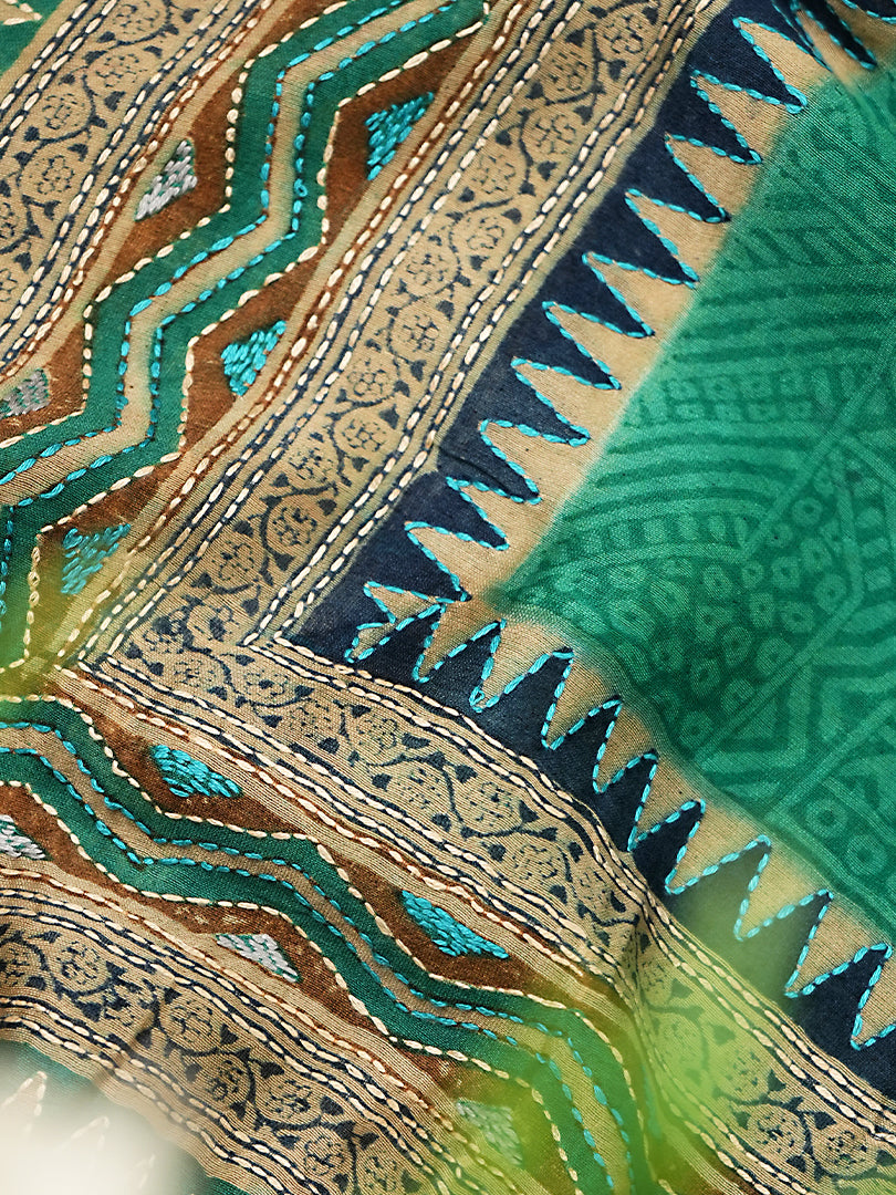 Turquoise Maheshwari Silk Suit Set With Kantha Detailing