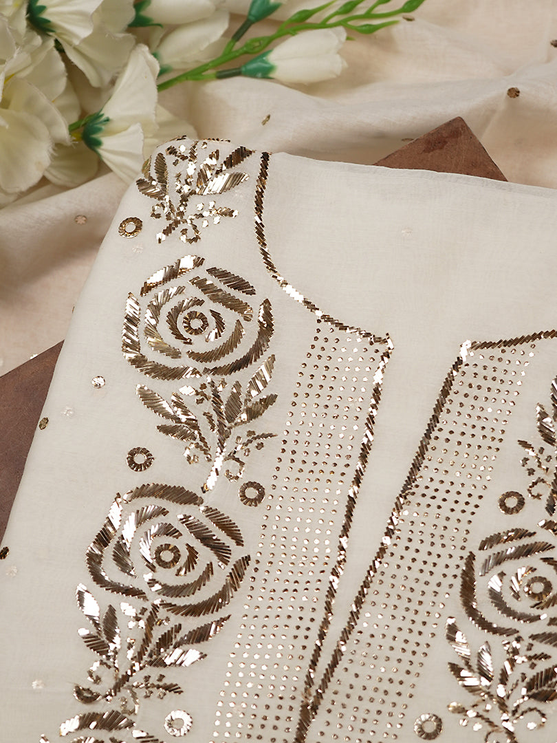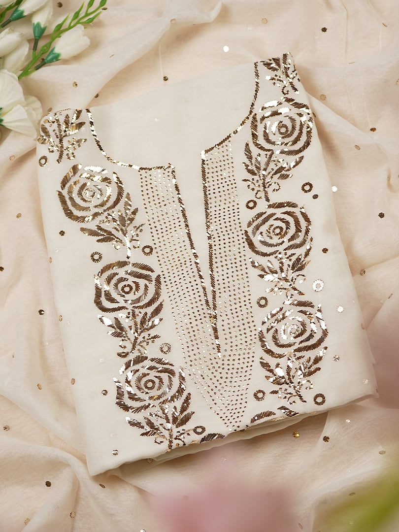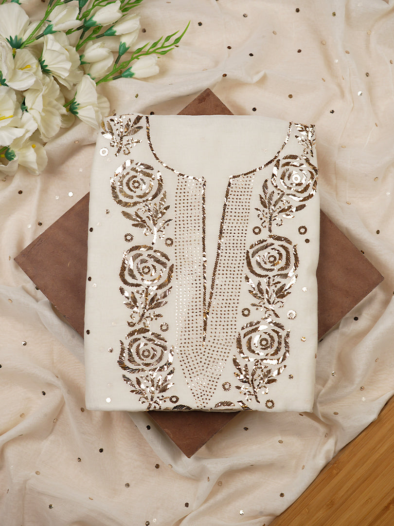 Graceful and understated, this pure mul chanderi suit set is adorned with delicate golden mukaish work that catches the light with every move. The soft white palette is paired with a subtly bordered matching dupatta and comfortable pure cotton bottoms. Ideal for intimate celebrations or serene festive mornings, it’s a timeless piece that speaks elegance without trying too hard.